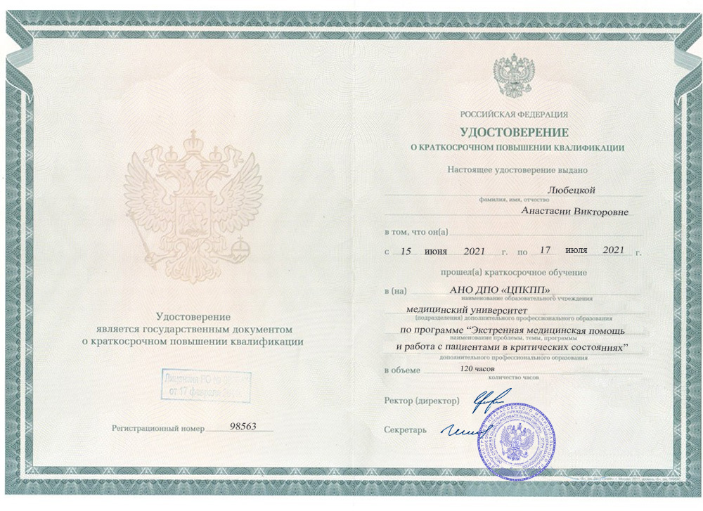 Удостоверение о квалификации Любецкой Анастасии Викторовны